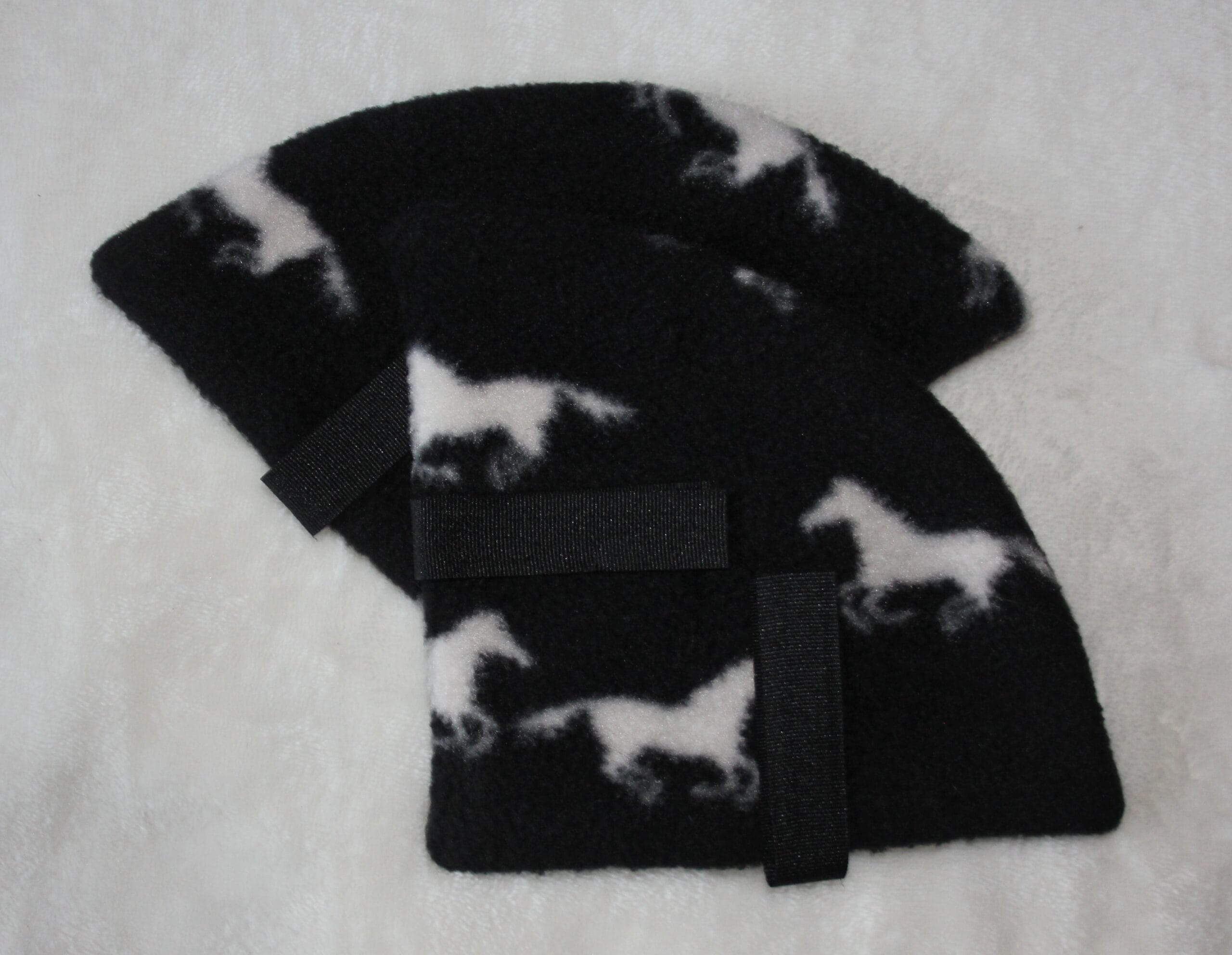 Black fleece riding hat ear warmers with a white horse pattern all over.  Easily attached to your riding hat harness with hook and loop.