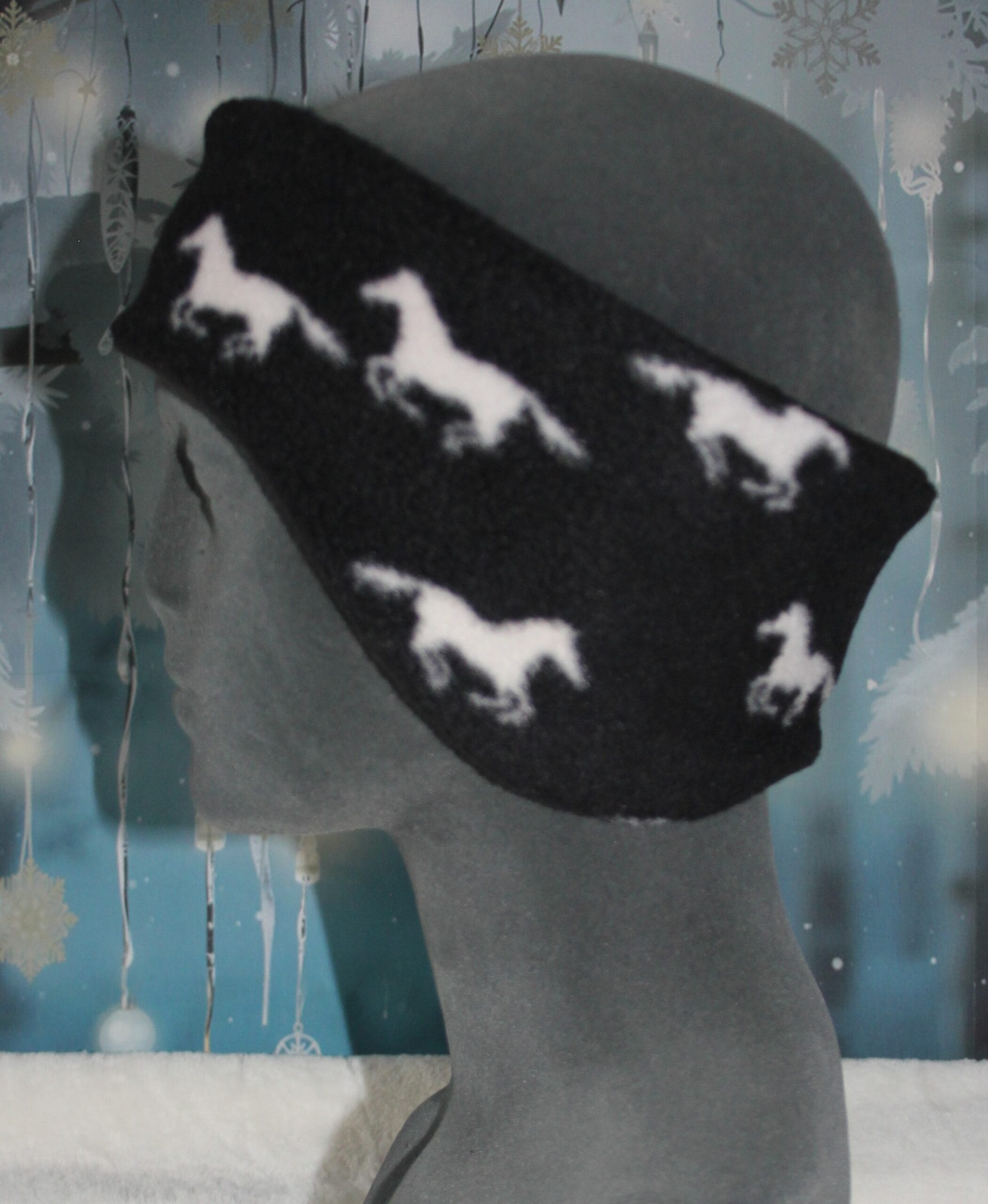 Black fleece headband ear warmer with white horses pattern.  Generous width for good coverage.  One size – Adult.